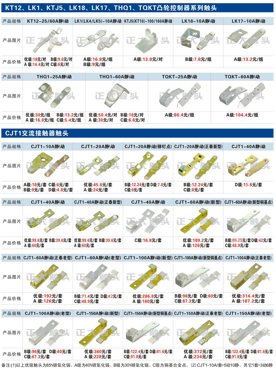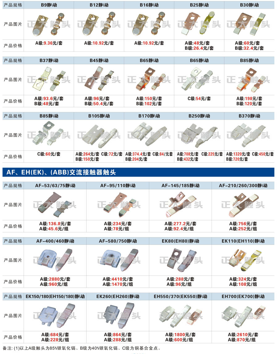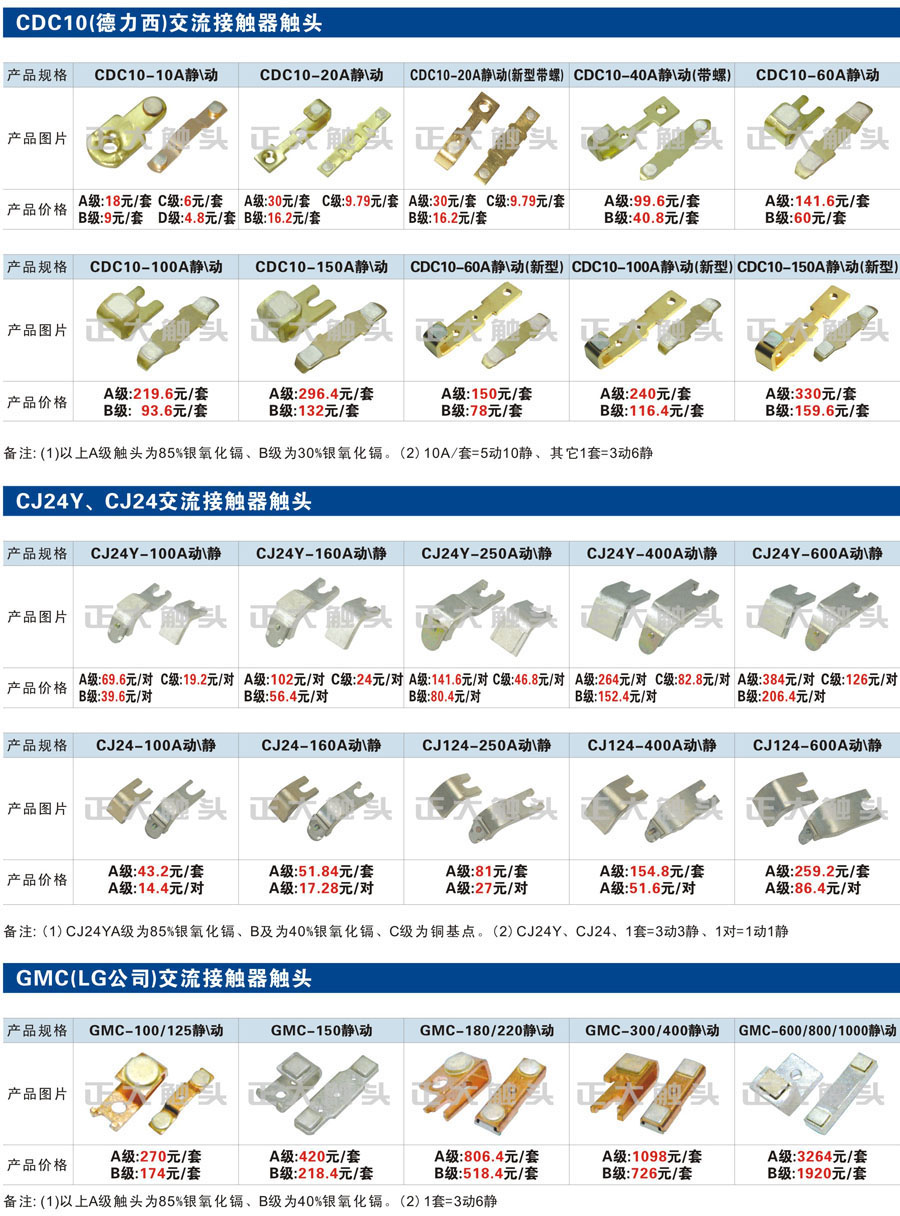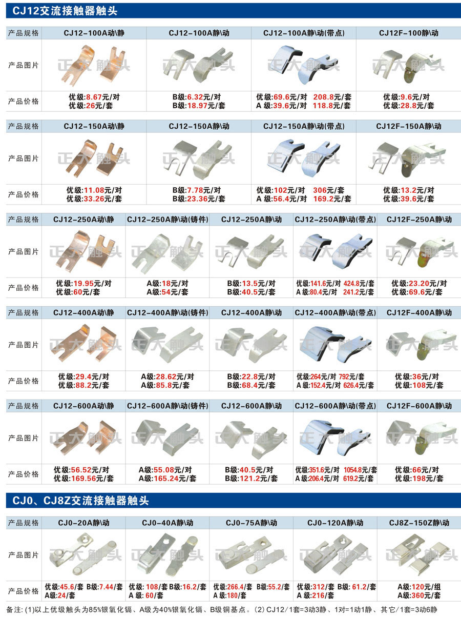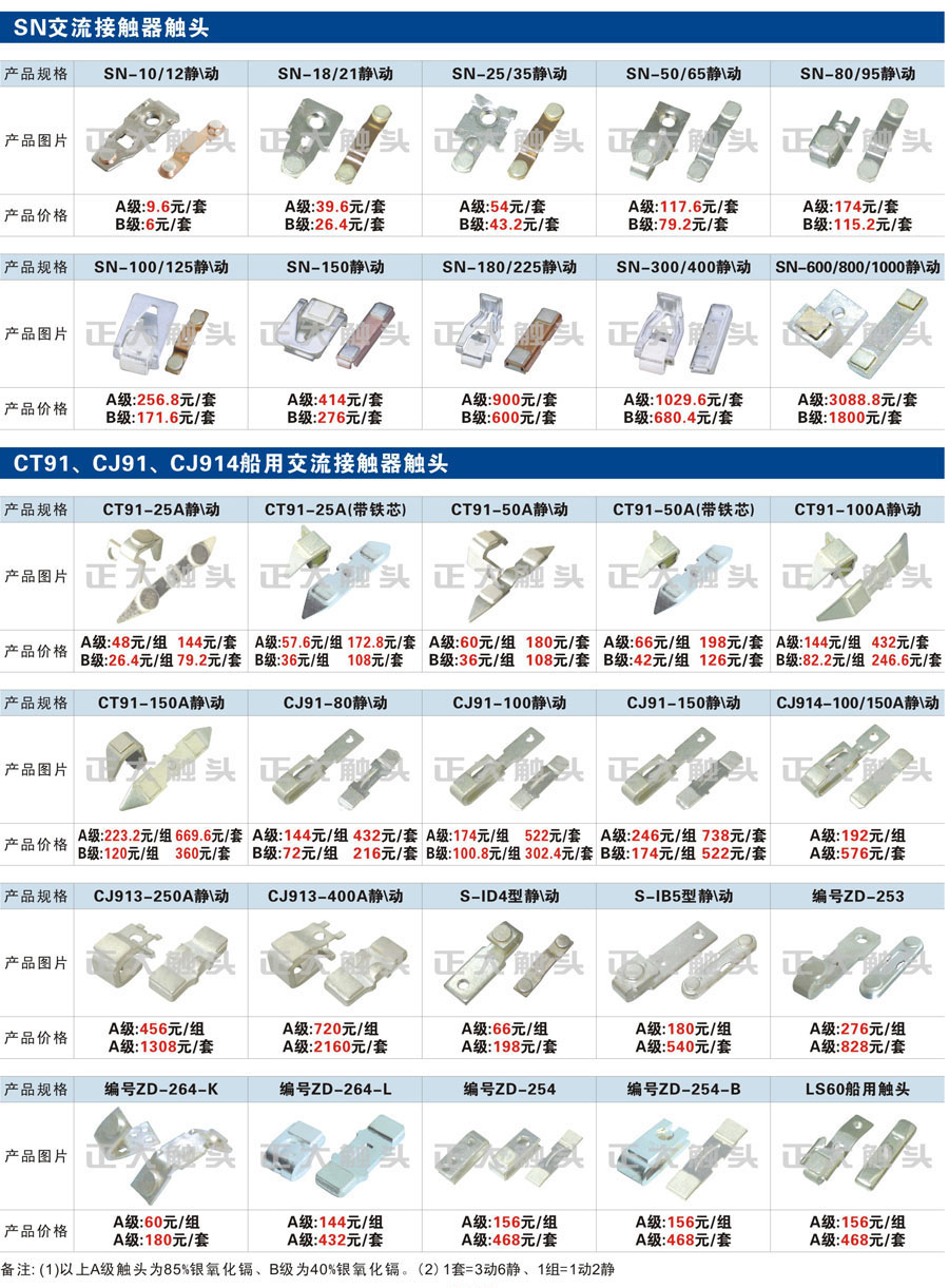觸頭元件作為電器開(kāi)關(guān)核心元件,主要用于接觸器,繼電器,斷路器,凸輪控制器,補(bǔ)償器,行程開(kāi)關(guān),腳踏開(kāi)關(guān),輔助開(kāi)關(guān)等。正火電氣現(xiàn)生產(chǎn)CJT1,CJX1,CJX2,CJX4,CJX5,CJX8(B系列)CJ20,CJ40,CJ12,CJ15,CJ24,CJ24Y,CJ0,CDC10,CJ91,CT91,CJ913,CJ914,CJ3,CJ8Z交流接觸器觸頭,CZ0,CZ1,CZ3,CZ17,CZ18,CG5直流接觸器觸頭,QJ3,QC83補(bǔ)償器觸頭,凸輪控制器,主令觸頭,KT10,KT12,KT14,KTJ1,KTJ5,KTJ6,KTJ15(QT5),LK1,LK17,LK18,THQ1,TQKT等;斷路器觸頭DW10,DW16,DW15,DW17,DW45,DZ10,DZ20,內(nèi)燃機(jī)觸頭,礦用觸頭,叉車(chē),吊車(chē)觸頭,JYN1,JYN2,ZN28,SN10,VS1,梅花觸頭等。進(jìn)口ABB系列AF,EH,EK,富士SC系列,日立H系列,施耐德LC1系列,西門(mén)子3TF,3TB系列,LG公司(LS產(chǎn)電)GMC系列,三菱機(jī)電SN系列。與國(guó)內(nèi)正泰,德力西,天正,人民等,國(guó)外ABB,施耐德,西門(mén)子,富士,三菱等廠家電氣配套。