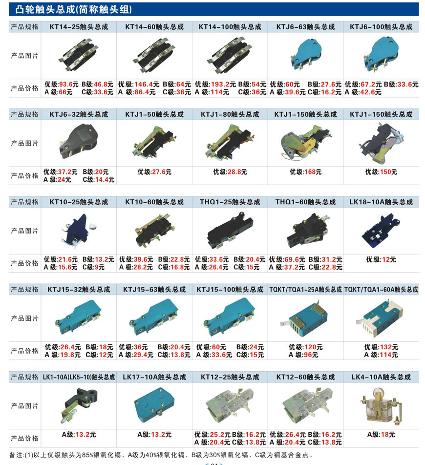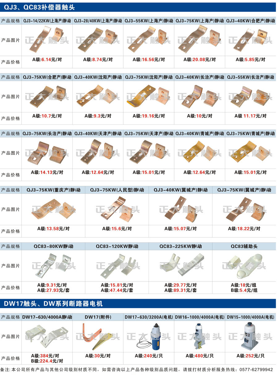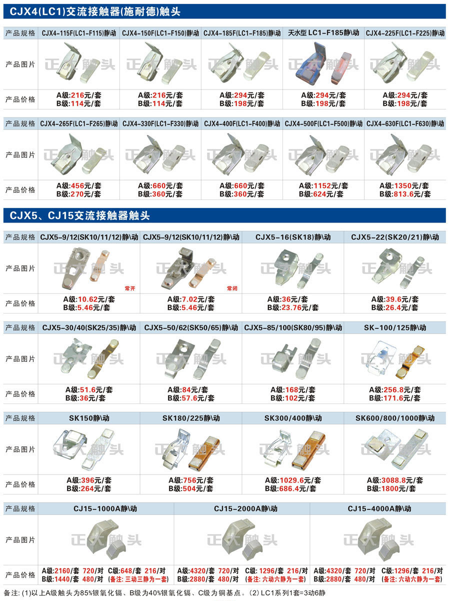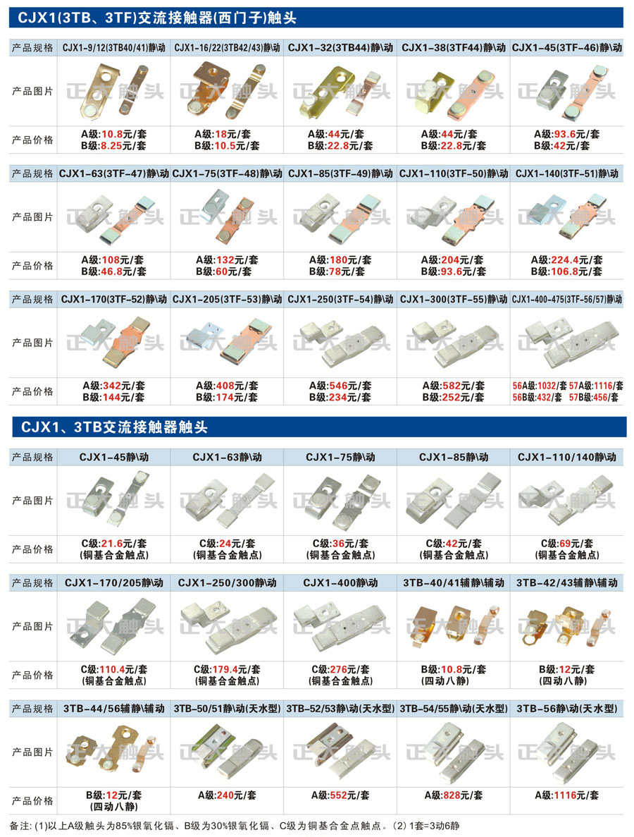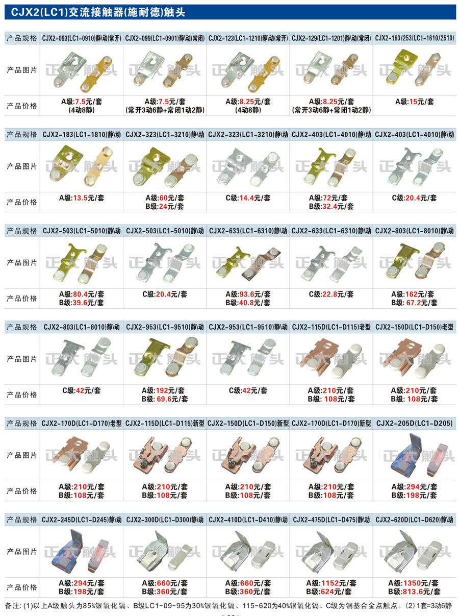 觸頭元件作為電器開(kāi)關(guān)核心元件,主要用于接觸器,繼電器,斷路器,凸輪控制器,補(bǔ)償器,行程開(kāi)關(guān),腳踏開(kāi)關(guān),輔助開(kāi)關(guān)等。正火電氣現(xiàn)生產(chǎn)CJT1,CJX1,CJX2,CJX4,CJX5,CJX8(B系列)CJ20,CJ40,CJ12,CJ15,CJ24,CJ24Y,CJ0,CDC10,CJ91,CT91,CJ913,CJ914,CJ3,CJ8Z交流接觸器觸頭,CZ0,CZ1,CZ3,CZ17,CZ18,CG5直流接觸器觸頭,QJ3,QC83補(bǔ)償器觸頭,凸輪控制器,主令觸頭,KT10,KT12,KT14,KTJ1,KTJ5,KTJ6,KTJ15(QT5),LK1,LK17,LK18,THQ1,TQKT等;斷路器觸頭DW10,DW16,DW15,DW17,DW45,DZ10,DZ20,內(nèi)燃機(jī)觸頭,礦用觸頭,叉車(chē),吊車(chē)觸頭,JYN1,JYN2,ZN28,SN10,VS1,梅花觸頭等。進(jìn)口ABB系列AF,EH,EK,富士SC系列,日立H系列,施耐德LC1系列,西門(mén)子3TF,3TB系列,LG公司(LS產(chǎn)電)GMC系列,三菱機(jī)電SN系列。與國(guó)內(nèi)正泰,德力西,天正,人民等,國(guó)外ABB,施耐德,西門(mén)子,富士,三菱等廠家電氣配套。